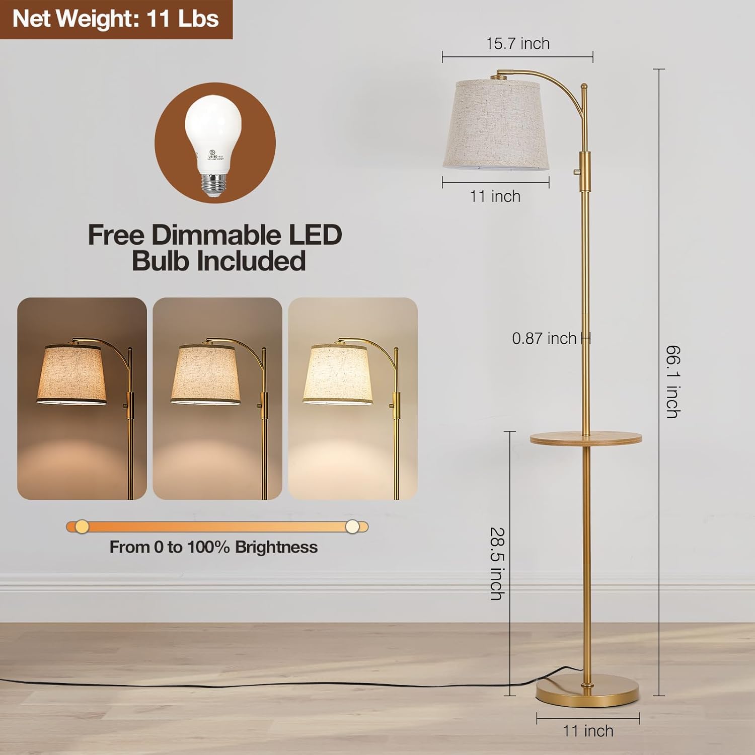 | Additional Features | Adjustable Lamp Head – Swivels 359° side to side and tilts 90° up and down, Built-in Side Table – Holds coffee, remote, or phone within easy reach, E26 Bulb Compatible – Works with most standard dimmable bulbs up to 60W, Rotary Dimmer Switch – Smooth 0-100% brightness adjustment, no remote needed, Wide & Sturdy Base – 11-inch diameter metal base for added stability |