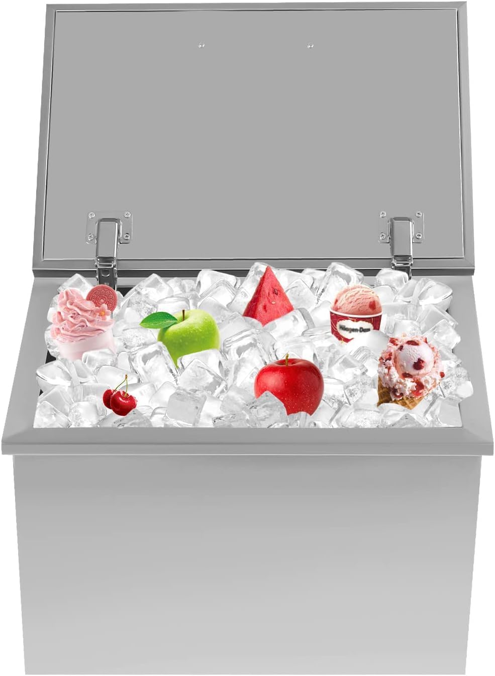 Drop In Ice Chest - Stainless Steel Cooler with Hinged CoverElevate your outdoor entertaining experience with our drop In Ice Chest, designed to keep your beverages frosty and your gatherings unforgettable!Product Features:Space-Saving Design: The drop-in installation is perfect for beverage shops, hotels, bars, and both indoor and outdoor kitchen countertops, saving valuable space while providing easy access to chilled drinks.Outdoor Available: You can take outdoor ice chest to outdoor places, bringing cold drinks to your party without the need for an electric refrigerator to create happy memories. Easy to Clean: The stainless steel surface is smooth and flat without grooves to hide dirt, making it easy to clean. You can directly rinse it with water and dry it.Transform your parties and backyard barbecues into unforgettable experiences with our Drop In Ice Chest. Whether it’s for beer, wine, or other beverages, this cooler is your go-to solution for keeping drinks ice-cold and easily accessible.