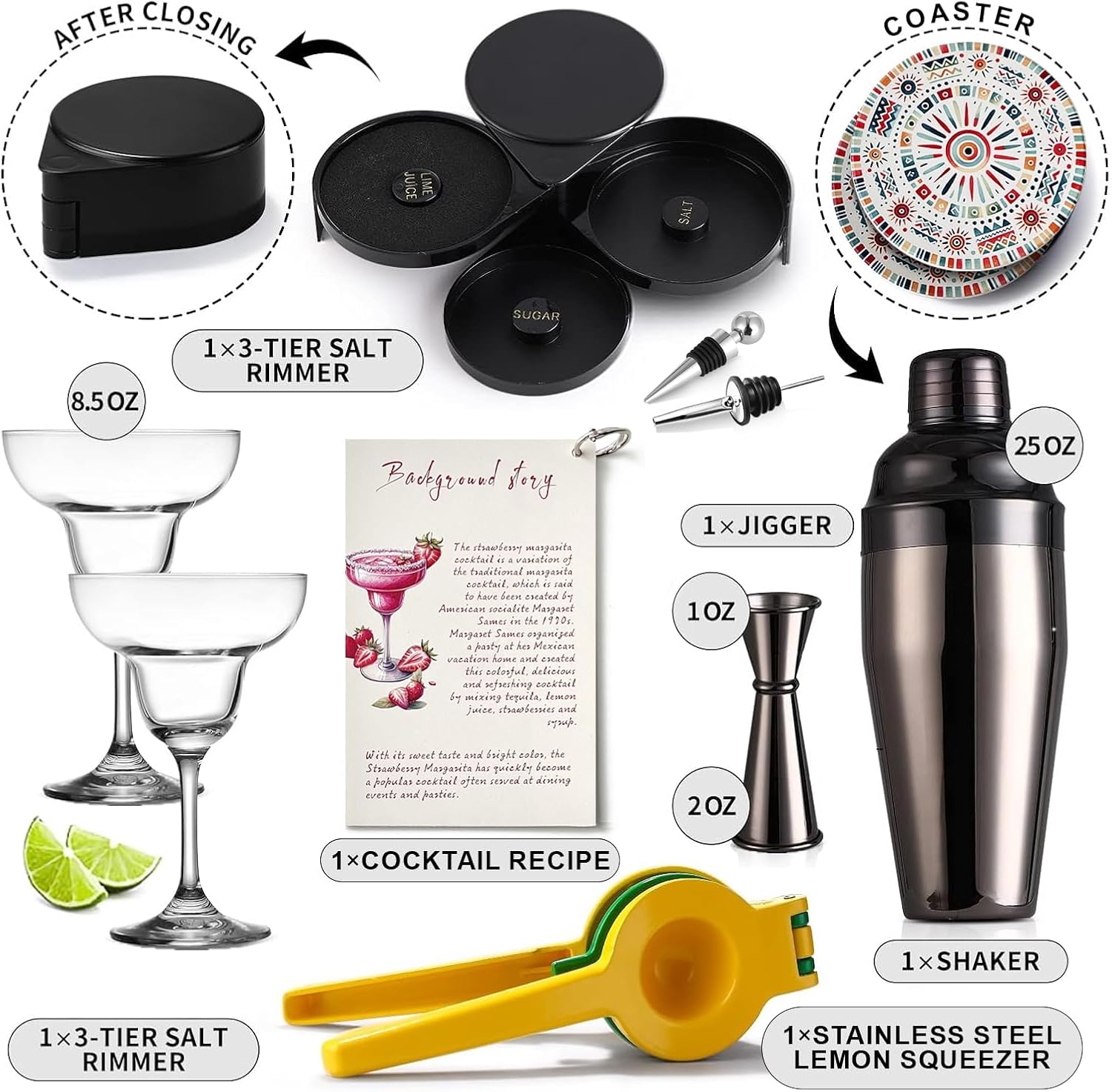 | Included Components | stainless steal shaker, double jigger, margarita glasses,lemon squeezer and 3-Tier glass rimmer. |
