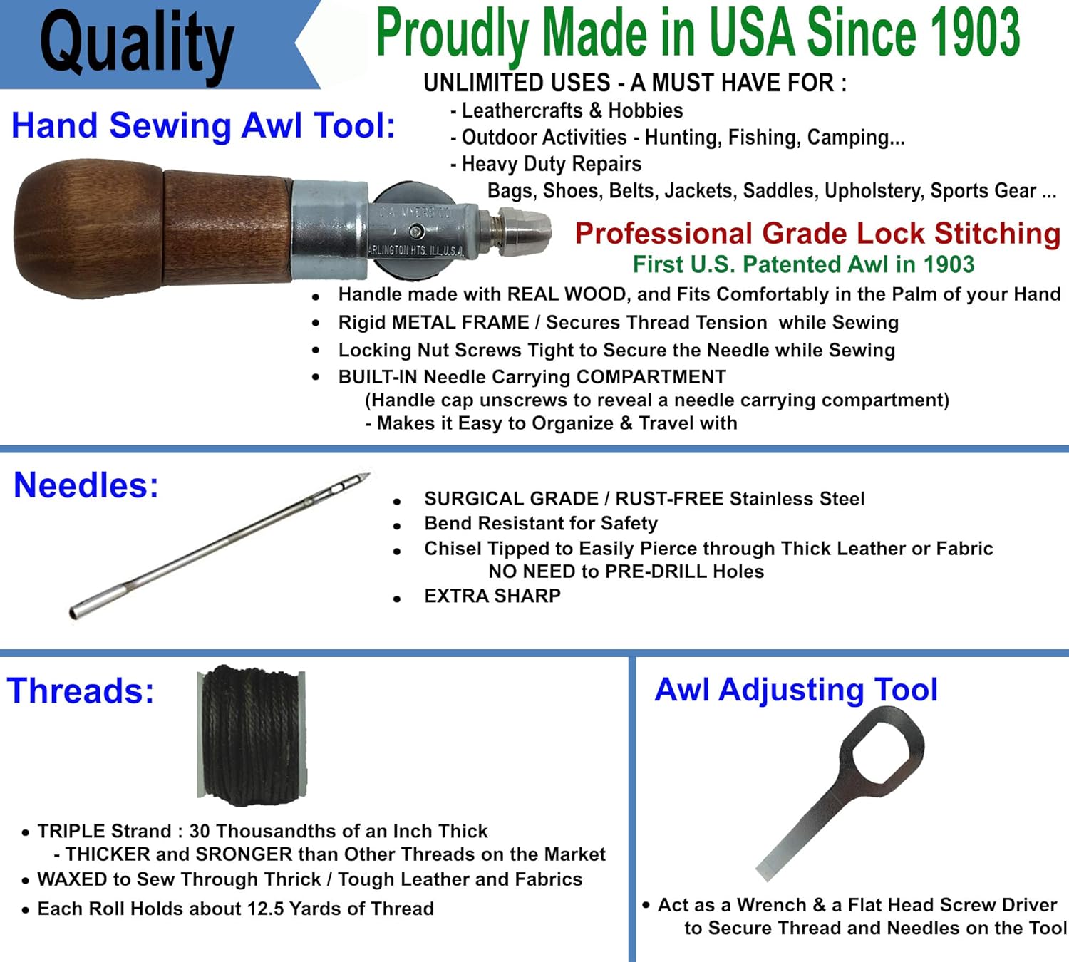 TRUSTED AMERICAN AWL MANUFACTURER since 1903.Expect it to last!Easy to Use Essential Tool for: Hobbies / Craft Work – Tailoring Leather, Canvas, and Cotton FabricAlterations & Repairs – Fix Bounce House / Shoes / Bags / Tents / Upholstery / Furniture / Sports Gear Repairs / Camping Gear, Sail Boat, Saddle, Awning, Tarp Repairs, Leathercrafts Hobbyists, Hunting & Fishing Gear … Many More…Features:COMFORTABLE FIT - Designed to comfortably fit in the palm of your hand while you work – Lightweight (2.5 oz) / Grip Handle: 4.25”CONVENIENT STORAGE – Needles can be stored inside the wooden handle when not in use, making it safe and easy to store. Small enough to fit in your pocket or tool bag.HEAVY DUTY – Steel structure with wooden handle.KEEPS TENSION on your thread while you stitch – NO THREAD TANGLING.SAFE – Needle is locked securely onto the awl by the cap nut. They will NOT come off or loosen while you stitch.PREMIUM QUALITY NEEDLES – Made from Surgical Grade Stainless Steel that are RUST FREE & Bend Resistant.PREMIUM QUALITY THREADS – Braided, Triple Strand, Waxed Threads – Extra Strong / Helps to sew through tough / dried out leather or fabric.Package Includes:1 x Stitching / Sewing Awl2 x Surgical Grade Stainless Steel Needles - 1 Each of Course (#8) and Fine (#5)2 x Thread Spools: Triple Strand Waxed - 1 Each of Black and White Specifications:Overall Length –- Not in Use (with the needles stored inside awl handle): 5.25 Inches- In Use (with needle secured during use): 6.5 ~ 6.75 Inches depending on the type of needlesDiameter – 1.5 InchesGrip Length – 4.25 InchesWeight – 2.5 OuncesMaterial – Heavy Duty Steel Construction / Wooden HandleManufactured in U.S.A.