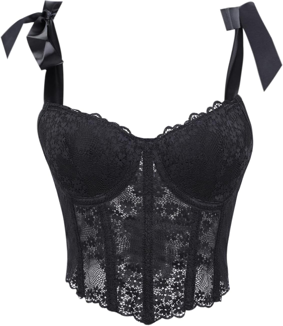 SHYMMUO Lace Corset Tops for Women Bustier Crop Top Sexy Lingerie Ribbon Straps Camisole Turn up your feminine charm with the SHYMMUO Lace Corset Top for Women, a stunning bustier crop camisole crafted from delicate floral lace. Featuring adjustable ribbon tie shoulder straps and structured push-up cups, this sexy corset top combines lingerie elegance with versatile everyday wear. Whether worn as bridal lingerie, paired with jeans for a night out look, or layered under a jacket for a chic outfit, this lace bustier ensures you feel confident and stylish. Material: Soft floral lace + polyester lining Closure: Back Lace Up closure Colors: Black Corset, White Corset, Pink Corset Occasions: Bridal lingerie, clubwear, party outfits, romantic dates, daily styling Size Guide (US): XS: Bust 30–32", Waist 23–25" S: Bust 32–34", Waist 25–27" M: Bust 34–36", Waist 27–29" L: Bust 36–38", Waist 29–31" XL: Bust 38–40", Waist 31–33"