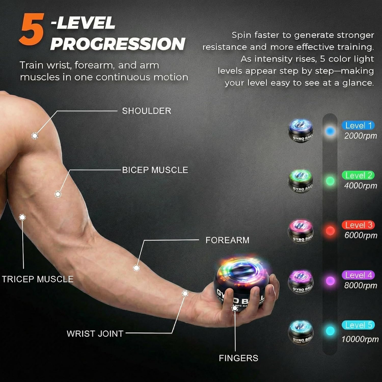 2026 Smart LED Torque Ball Pro – Precision Wrist Training Tool Designed for focused hand and forearm training, the 2026 Smart LED Torque Ball Pro delivers controlled gyroscopic resistance with visual feedback. This advanced wrist exerciser helps improve stability, coordination, and endurance through smooth, manual motion Performance Highlights: Durable Metal Construction – Finished with a refined metallic surface that enhances grip confidence and control during rotation. High-Density Zinc Core – A reinforced internal rotor adds significant weight, producing stronger centrifugal resistance as speed increases. Integrated LED Counter – Tracks rotation performance while five-color LED lights respond dynamically to spin intensity. Portable Training Setup – Includes a storage pouch and adjustable wrist strap for safe, convenient use at home or on the go. What It Helps Improve: ✓ Wrist & Grip Control – Supports hand strength development for sports, training, and daily conditioning. ✓ Forearm Endurance – Progressive resistance builds as rotation stabilizes, encouraging consistent muscle engagement. ✓ Focus & Stress Relief – Keeps hands active during work breaks, helping release tension through rhythmic motion. ✓ Stable, Smooth Rotation – The weighted metal core promotes balanced spinning and a solid training feel. Operating Instructions: Wind: Hold the ball level and press the center rotor alternately with both thumbs along the arrows until resistance stops. Activate: Secure the outer shell in one hand and release the center to begin rotation. Maintain: Flip your wrist smoothly to sustain momentum—controlled motion delivers the best resistance response. NOTE: Always keep the ball level when winding; tilting or inverting will prevent proper spring tension. Do not touch the inner rotor while spinning—allow it to slow down naturally after use. Resistance increases gradually with speed; steady wrist motion produces the best results. Most users master the spin technique within 1–2 days—stick with it! Pro tip: Start by spinning it like you’re shaking an ice cube in a glass—it works!