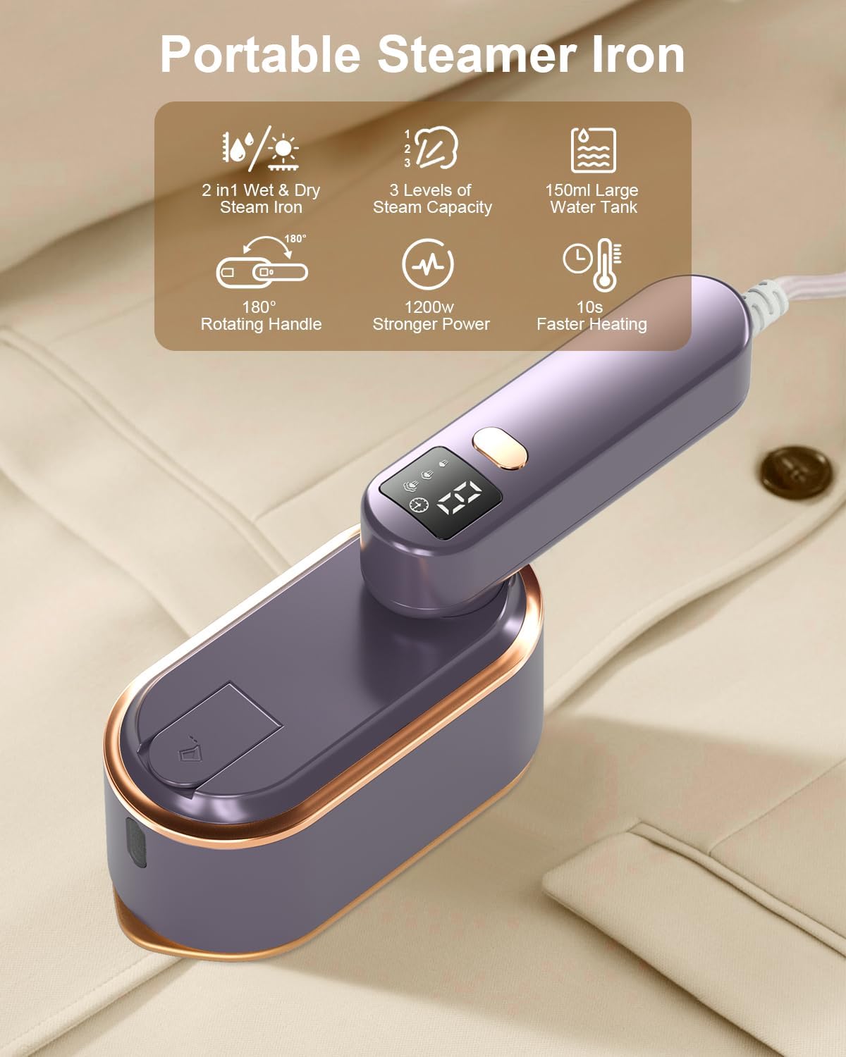 | Product Benefits | 3 levels of steam,1200w high power, Convenient to store and carry,10s fast heating,Suitable for various types of clothing |